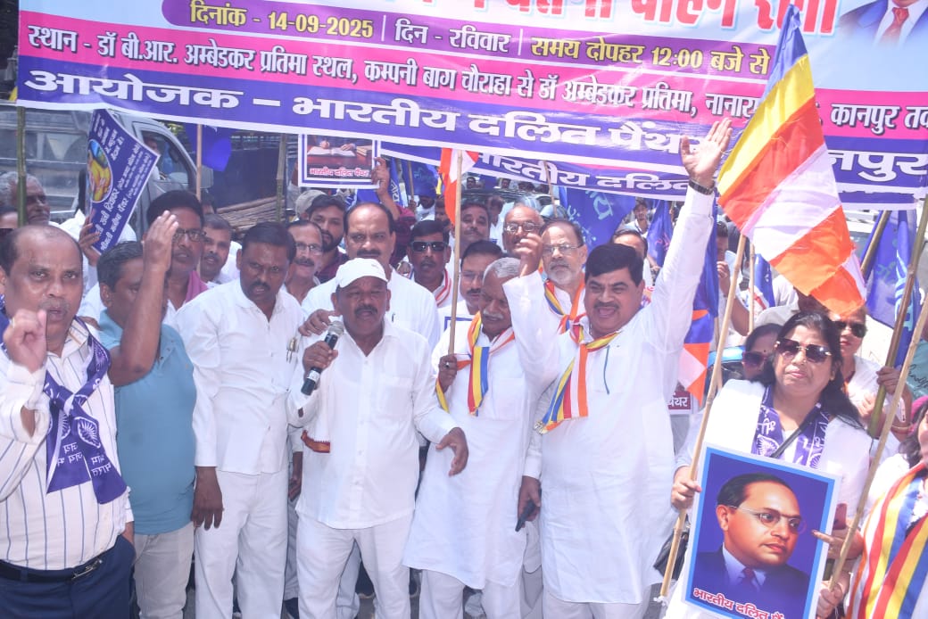 कानपुर, आज दिनांक 14 सितंबर 2025 को भारतीय दलित पैंथर कानपुर नगर ईकाई के तत्वावधान में डॉ बाबासाहेब भीमराव अंबेडकर प्रतिमा स्थल कंपनी बाग चौराहा से डॉ अंबेडकर “धम्म चेतना वाहन रैली” का आयोजन किया गया। डॉ अंबेडकर धम्म चेतना वाहन रैली का समापन अंबेडकर प्रतिमा स्थल नानाराव पार्क, कानपुर नगर में समाप्त हुई।धम्म चेतना वाहन रैली के संयोजक एवं भारतीय दलित पैंथर के प्रांतीय अध्यक्ष धनीराम पैंथर जी ने आए हुए जन समूह को संबोधित करते हुए बताया के विगत वर्षों के भांति इस वर्ष भी कृषि मंडी समिति पुखरायां कानपुर देहात में 32वें विशाल बौद्ध धम्म दीक्षा समारोह एवं डॉ आंबेडकर मेला का आयोजन दिनांक 2 अक्टूबर 2025 को किया जा रहा है जिसमें महान सम्राट महामानव रावण,अशोक सम्राट, तथागत गौतम बुद्ध व डॉ साहब भीमराव अंबेडकर की शोभा यात्रा निकाली जाएगी। जहां पर लगभग 10000 लोग हिंदू धर्म छोड़कर बौद्ध धर्म की दीक्षा ग्रहण करेंगे।कार्यक्रम में प्रमुख रूप से यशवंत सिंह यादव संस्थापक, अशोक यादव प्रदेश अध्यक्ष, साजिद सर, पास्टर जितेंद्र सिंह.इंजी,कोमल सिंह,डॉ संजय गुप्ता, विनोद पाल,सुभाष साहू, हरिओम खन्ना,सुधीर कुमार,चंदन निषाद,एम बी गौतम,शैलेंद्र कुमार प्रांतीय महासचिव,रमेश बौद्धाचार्य ,डॉ सुभाष चंद्र,आर ए गौतम,सतीश चंद्र,आनंद प्रकाश, शिव प्रताप बौद्ध,श्रवण कुमार,डॉ जे आर बौद्ध, हरिश्चंद्र,लाल जी गौतम,रवि गौतम, रामचंद्र निषाद, अरुण कुशवाहा,भगवान दीन वर्मा,राहुल गौतम,अजय वर्मा, जीतू सोनकर, कुनाल,रमेश कमल,सफीक सिद्दीकी,मीना वर्मा, राधेश्याम भारती,दीपक राज, सुभाष यादव,वरूण पैंथर,मुन्ना गौतम,सरवन कुमार पंकज झा,मुकेश गौतम,राहुल देव यादव, अनिल जायसवाल, अनिल प्रजापति, रोशन साहू, आशीष गुप्ता, विनीत कुमार, जय कठेरिया,सोनू टी स्टाल,रिंकू गौतम, मनीषा पैंथर, रानी दिवाकर,जीतू पैंथर, बीरेंद्र बहुजन, संदीप कुरील, पिंकी चंद्रा,सुधा गौतम, अर्चना,सुनीता, नवीन यादव, प्रदीप कुमार,परशुराम ,रिजवान, दीपक गौतम, जितेन्द्र संखवार,अवधेश कुमार,मस्तराम, पुनीत , अज्जू पैंथर सहित सैकड़ो लोग उपस्थित रहे।
