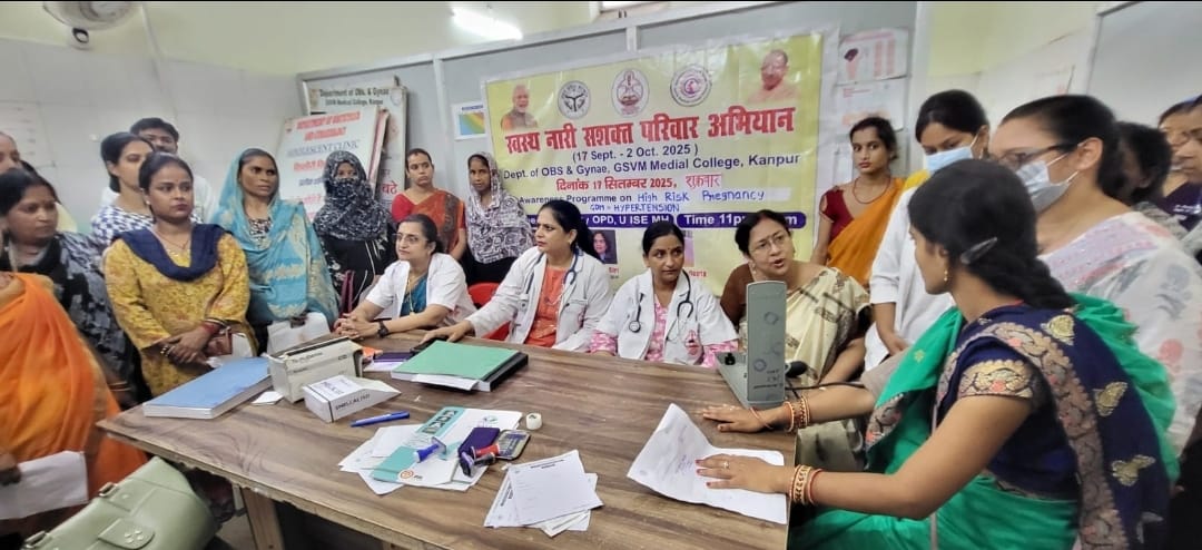 कानपुर-स्वस्थ नारी सशक्त परिवार अभियान के अंतर्गत तीसरे दिन जीएसवीएम मेडिकल कॉलेज कानपुर के स्त्री एवं प्रसूति रोग विभाग द्वारा उच्च जोखिम वाली गर्भावस्था जागरूकता कार्यक्रम का सफल आयोजन किया गया कार्यक्रम का आयोजन प्राचार्य डॉ. संजय काला एवं उप प्राचार्या डॉ. ऋचा गिरी, प्रमुख अधीक्षक डॉ आरके सिंह, विभागाध्यक्ष प्रोफ़ेसर डॉ. रेनु गुप्ता व नोडल ऑफिसर डॉ नीना गुप्ता के मार्गदर्शन में किया गया कार्यक्रम के अवसर पर डॉ रेनू गुप्ता ने कहा कि गर्भावस्था मे लगभग 10 से 15% गर्भवती महिलाओं में बढ़े हुए रक्तचाप और बढ़े हुए शुगर की वज़ह से गर्भावस्था में जटिलताएं बढ़ जाती है उन्होंने बताया कि समय पर जांच एवं संतुलित आहार अत्यंत आवश्यक है इसी क्रम में नोडल ऑफिसर डाॅ नीना गुप्ता ने बढ़े रक्तचाप की वज़ह से होने वाली परेशानियों जैसे अत्याधिक वजन बढ़ना, चक्कर आना, झटके आना आदि के बारे में बताया समन्वयक डॉ. शैली अग्रवाल एवं डॉ दिव्या त्रिपाठी द्वारा सभी प्रसूताओं को खतरे के संकेतों तथा गर्भावस्था के दौरान नियमित जांच एवं संतुलित आहार की उपयोगिता के बारे मे बताया। इस दौरान उपस्थित विशेषज्ञ चिकित्सकों द्वारा 108 गर्भवती महिलाओं को परामर्श एवं बीपी तथा शुगर की जांच की गई 108 में से लगभग 49 महिलाएं हाई रिस्क प्रेगनेंसी वाली पाई गई जिसमें 21 का ब्लड प्रेशर तथा 9 के शुगर बढ़े हुए थे इस दौरान मुख्य रूप से कार्यक्रम में डॉ रश्मि गुप्ता, डॉ सुचिता त्रिपाठी, डॉ पंखुड़ी जायसवाल सहित सभी संकाय सदस्यों का सहयोग रहा