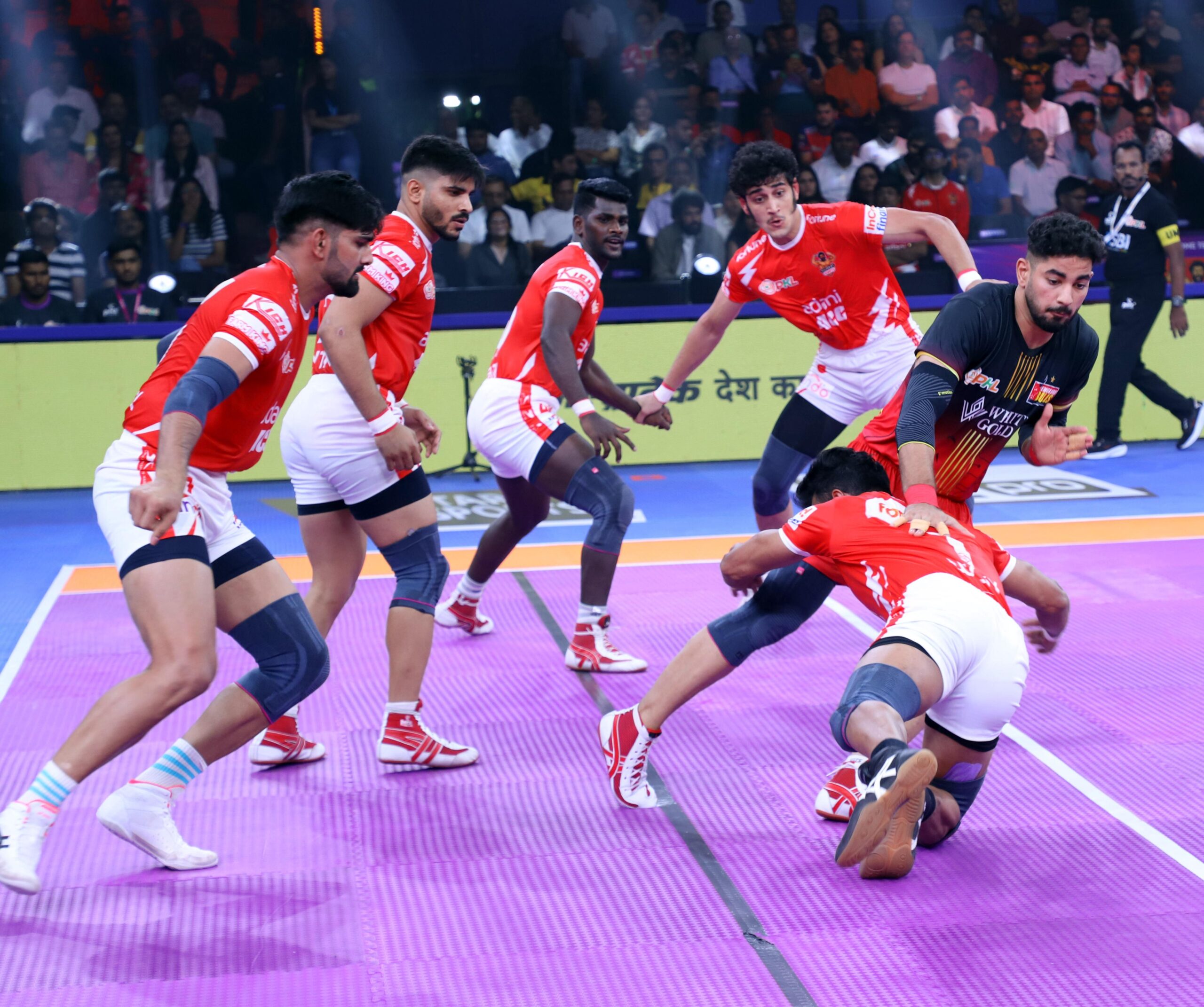 खेल के बीच-बिच बुल्स और गुजरात ने जोरदार खेल दिखाया। विश्वंथ वी ने अहम खेल में गुजरात को 5-3 से आगे किया, लेकिन आशीष, राकेश और प्रतीक की सूझबूझ ने बुल्स को पलटवार का मौका दिया। बुल्स ने धीरे-धीरे बढ़त बनाकर 13-12, फिर 15-12, और हाफटाइम तक 17-13 की लीड ले ली।