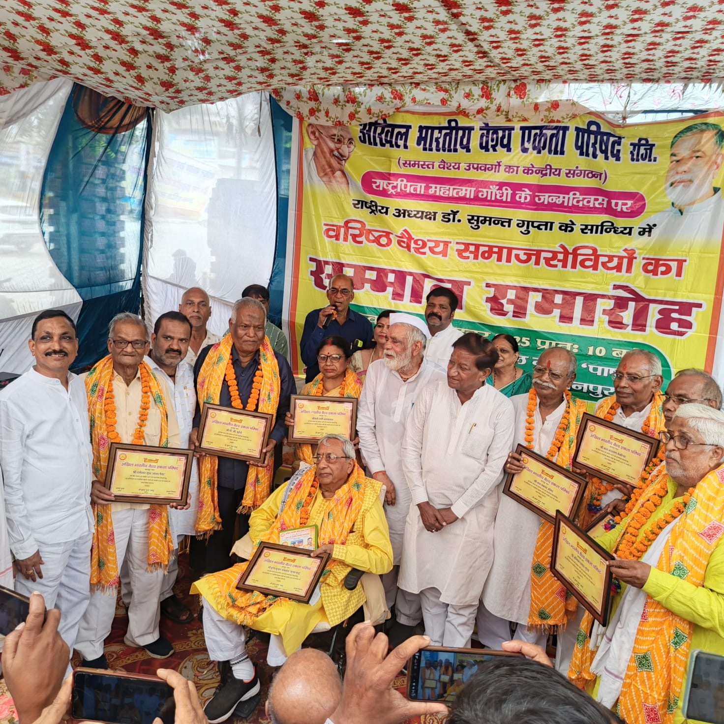 अखिल भारतीय वैश्य एकता परिषद कानपुर के तत्वाधान में राष्ट्रपिता महात्मा गांधी जयंती के अवसर पर श्यामलाल गुप्त पार्षद वाटिका फूल बाग में वैश्य समाज के वरिष्ठ समाजसेवियों का सम्मान किया गया राष्ट्रीय अध्यक्ष सुमंत गुप्ता व नगर अध्यक्ष अजय गुप्ता एवं वरिष्ठ जनों द्वारा दीप प्राजुलन एवं ईश वंदना करके कार्यक्रम प्रारंभ हुआ आए हुए अतिथियों का स्वागत अजय गुप्ता नगर अध्यक्ष ने किया डॉक्टर सुमन गुप्ता ने कहा आज हम जिनके सम्मान करने जा रहे हैं वह सब हमारे समाज के भामाशाह है जिनकी वजह से आज देश व समाज प्रगति कर रहा है और हम गौरवान्वित हो रहे हैं हम लोग आज गांधी जयंती के अवसर पर कार्यक्रम कर रहे हैं किंतु केंद्र सरकार को धन्यवाद देना चाहते हैं कि उन्होंने नवरात्रि के अवसर पर देश में जीएसटी को दो ही कर प्रणाली में ला दिया और काफी आम जनता को के इस्तेमाल में आने वाली चीजों पर टैक्स हटा दिया इंश्योरेंस दवा पाठ्यक्रम सामग्री में टैक्स हटा दिया जिससे आम जनता को बहुत लाभ मिलेगा सामान सस्ते हो जाएंगे इसी प्रकार आयकर में काफी छूट दिया है जिससे लोगों को कैपिटल बढ़ेगी आगामी 2027 में प्रदेश विधानसभा के निर्वाचन होने जा रहे हैं अतः वॉइस समाज के अभी से तैयारी करनी होगी सुरेश गुप्ता उपाध्यक्ष ने कहा कि वैसे समाज को अपनी ताकत का एहसास करना होगा प्रधानमंत्री द्वारा खादी और ग्रामोद्योग स्वदेशी जो अपने संबोधन में कहा है कि जनमानस को एक न एक वस्तु खरीदनी चाहिए इसके लिए उन्हें बहुत-बहुत साधुवाद पर आज का यह जो कार्यक्रम वर्ष एकता परिषद द्वारा आयोजित हो रहा है वह वह समाज के वरिष्ठ समाज सेवायों का सम्मान है कृष्ण कुमार अग्रवाल मुन्ना बाबू रामेश्वर गुप्ता लाला भैया पी,सी,कुरेले रानी जयसवाल सत्यनारायण नेवटिया अंबिका प्रसाद गुप्ता द्वारा सुरेश गुप्ता कुंज बिहारी गुप्ता व चंद्र प्रकाश ओमर सभी सामाजिक बंधुआ का सम्मान डॉक्टर सुमंत गुप्ता व एमएलसी सलिल बिश्नोई द्वारा किया गया कार्यक्रम में सुरेश गुप्ता विजय माहेश्वरी धम प्रकाश गुप्ता रवि गुप्ता विनोद गुप्ता राम प्रकाश ओमर अजय मित्तल वंदना गुप्ता रमेश गुप्ता दिनेश गुप्ता स्वतंत्र अग्रवाल किशन केसरवानी अखिलेश गुप्ता सरोज गुप्ता पार्षद विकास जायसवाल अमित गुप्ता आदर्श गुप्ता संतोष बगड़ मुनीद्र गुप्ता आकाश जायसवाल रमेश गुप्ता आज काफी संख्या में वैश्य समाज के लोग उपस्थित कार्यक्रम का संचालन महामंत्री कृष्णा गुप्त बब्बू ने किया!