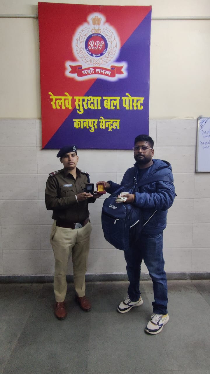 कानपुर। आरपीएफ कानपुर सेंट्रल में तैनात एस.एन. पाटीदार अपने हमराह स्टाफ के साथ स्टेशन पर चल रही स्टाफ परीक्षा के दौरान बढ़ी भीड़ को सुव्यवस्थित करने के लिए प्लेटफॉर्म संख्या 01 पर ड्यूटी पर मौजूद थे। इसी दौरान हावड़ा एंड की ओर एक काले रंग का सफारी पिट्ठू बैग लावारिस अवस्था में पड़ा मिला।आरपीएफ कर्मियों द्वारा आसपास मौजूद यात्रियों से बैग के संबंध में पूछताछ की गई, लेकिन किसी ने भी बैग का स्वामी होने की पुष्टि नहीं की। इसके बाद सुरक्षा मानकों के अनुरूप बैग को आरपीएफ कार्यालय लाया गया और जांच करने पर उसमें लाखों रुपये मूल्य के सोने व हीरे के गहने तथा लगभग 25,000 रुपये नकद पाए गए।