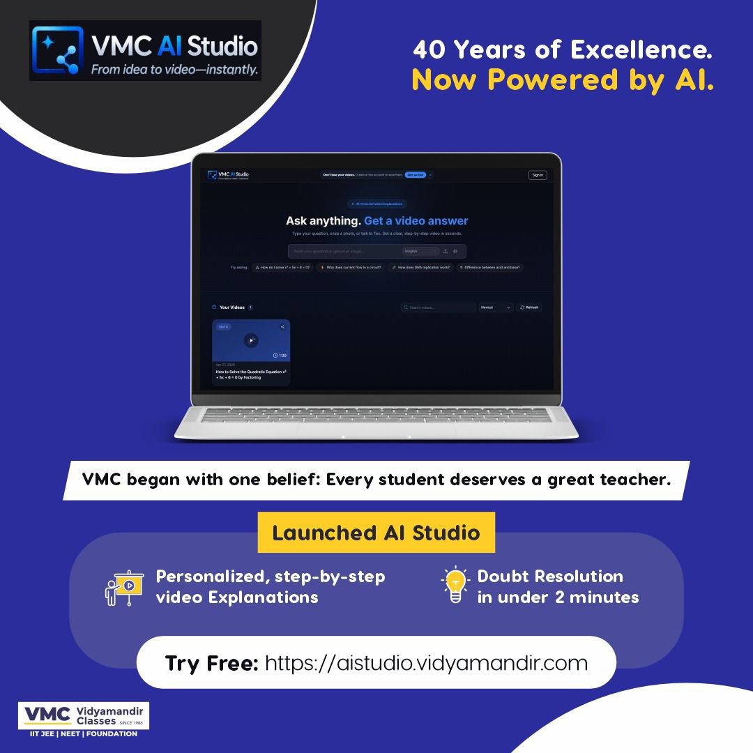 AIstudio.vidyamandir.com के जरिए उपलब्ध यह प्लेटफॉर्म पूरी तरह AI तकनीक पर आधारित है। छात्र जैसे ही अपना सवाल डालते हैं, सिस्टम तुरंत उसका विश्लेषण कर डिटेल्ड वीडियो एक्सप्लनेशन तैयार करता है। यह पारंपरिक डाउट क्लासेस के इंतजार को खत्म करता है और पर्सनलाइज्ड लर्निंग को सीधे स्टूडेंट्स की स्क्रीन तक पहुंचाता है।