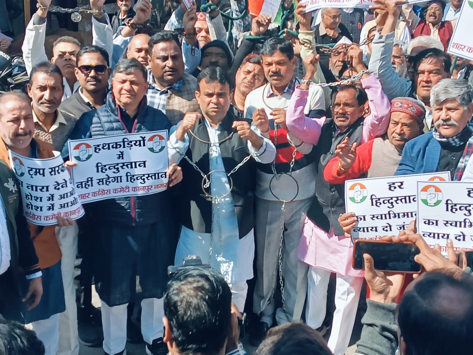 कानपुर,शहर कांग्रेस कमेटी कानपुर नगर द्वारा आज दिनांक 8 फरवरी 2025 को कानपुर के कचहरी स्थित चेतना चौराहे से भारत सरकार की कमजोर नीतियों के कारण अमेरिका द्वारा किए गए भारतीयों के अपमान जिसके अंतर्गत अप्रवासी भारतीयों को एक कैदी के रूप में माल वाहक जहाज में बैठा कर अमानवीय यातनाएं देने के बाद भारत भेजने पर पूरे भारत की 130 करोड़ जनता के अपमान के रूप में लेने पर प्रदेश कांग्रेस के नेतृत्व के आह्वान पर विशाल प्रदर्शन मार्च निकालकर कलेक्ट्रेट मुख्यालय पर प्रदर्शन किया गया एवं राष्ट्रपति के नाम संबोधित ज्ञापन दिया गया। जिसके अंतर्गत सभी कांग्रेस जन प्रतीकात्मक विरोध के रूप में अपने हाथ और पैर में बेड़ियां व हथकड़ियां लगाकर प्रदर्शन किया ।