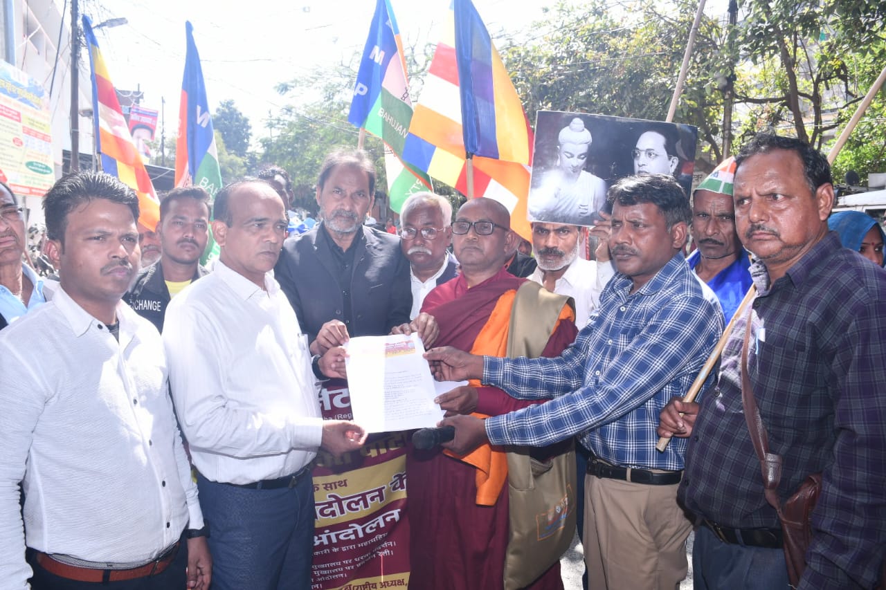 कानपुर, बुद्धिस्ट इंटरनेशनल नेटवर्क के जिला अध्यक्ष भन्ते रत्नदीप के नेतृत्व में जिलाधिकारी के माध्यम से महामहिम राष्ट्रपति को ज्ञापन सोपा गया। ज्ञापन के दौरान बहुजन मुक्ति पार्टी के प्रधान कार्यकारिणी प्रदेश अध्यक्ष शामिल हुए बुद्धिस्ट इंटरनेशनल नेटवर्क को अपने कार्यकर्ताओं के साथ पहुंचकर समर्थन किया कहां की अत्यंत दुख के साथ कहना पड़ रहा है कि जहां पर शाक्य मुनि बुद्ध को संबोधि प्राप्त हुई उस पवित्र जगह पर ब्राह्मणों द्वारा कब्जा करना यह अत्यंत पीड़ादायक बात है। छेदी खोटे ने बताया कि तारीखों को बुद्धिस्ट इंटरनेशनल नेटवर्क के द्वारा देशव्यापी चरणबद्ध आंदोलन घोषित किया गया है।देशव्यापी चरणबद्ध आंदोलन के चरण।03 मार्च 2025 को सभी जिलों के जिलाधिकारी के द्वारा महामहिम राष्ट्रपति दूसरा चरण : 08 मार्च 2025 को सभी जिलों के जिला मुख्यालय पर धरना प्रदर्शन। तिसरा चरण: 22 मार्च 2025 को सभी जिलों के जिला मुख्यालय पर प्रदर्शन रैली। चौथा चरण: 09 अप्रैल 2025 को देशव्यापी जेल भरो आंदोलन।पांचवा चरण: 01 जुलाई 2025 को भारत बंद आंदोलन।देशव्यापी चरणबद्ध आंदोलन के मुद्दे महाबोधि टेंपल एक्ट 1949 यह बौद्धों ने नहीं बनाया है यह तो ब्राह्मणों ने अपना बर्चस्व कायम करने के लिए बनाया हुआ षडयंत्रकारी कानून है। उसके माध्यम से ब्राह्मणों का महाबोधि महाविहार पर नाजायज कब्जा हो गया है। इस एक्ट से अंतरराष्ट्रीय धरोहर के कानून का भी उल्लंघन भी होता है। इसलिए महाबोधि टेंपल एक्ट 1949 को रद्द करके इसकी जगह नया एक्ट बनाया जाए जिसमें सारे के सारे सदस्य यह बौद्धों के होने चाहिए। ज्ञापन के दौरान जिला अध्यक्ष रत्नदीप मनोज भटनागर शाकिर अली उस्मानी रामपाल कोरी राजेंद्र बौद्ध राज नारायण गौतम प्रधान कार्यकारी प्रदेश अध्यक्ष छेदी खोटे राजू यादव मोहम्मद इरफान बबलू खोटे राजकुमारी गौतम प्रजापति राहुल दिवाकर सरोज गौतम नवीन जय एडवोकेट बबलू वर्मा याकूब सिद्दीकी सय्यद नजब आदि रहे।