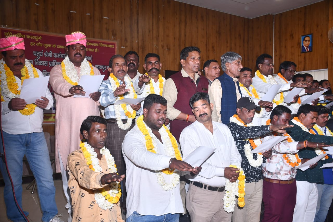 कानपुर, चतुर्थ श्रेणी कर्मचारी यूनियन नगर निगम विकास प्राधिकरण जलकल कानपुर का शपथ ग्रहण कार्यक्रम प्रमिला सभागार मोतीझील में सम्पन्न हुआ।शपथ ग्रहण कार्यक्रम में नवनिर्वाचित पदाधिकारियों ने यह शपथ ली कि हम कर्मचारियों को न्याय अधिकार सम्मान दिलाने एवं शोषण से मुक्ति दिलाने हेतु ध्येयनिष्ठा के साथ शासन और प्रशासन से संघर्ष करंगे। शपथ ग्रहण कार्यक्रम में यूनियन के महामंत्री सुरेश कुमार गहरवार ने कर्मचारियो को संबोधित करते हुए कहा कि आउटसोर्सिग व अचयनित संविदा कर्मचारियों को जीने लायक वेतन दिये जाने, संविदा कर्मचारियों के नियमतीकरण करके आबादी के अनुपात में कर्मचारियों की संख्या बढ़ाये जाने, संविदा कर्मचारियों को बोनस भुगतान करने, कर्मचारियों का इलाज कराने हेतु कैशलेस व्यवस्था आदि दिलाये जाने हेतु आन्दोलन करेंगे।शपथ लेने वालों में जीतेन्द्र उर्फ बबलू ठाकुर, अध्यक्ष सुरेश कुमार गहरवार, महामंत्री राम प्रकाश, उपाध्यक्ष भगवानदीन कुक्कू, उपाध्यक्ष बृजभान, जगदीश बक्शी, शिवबरन,विमल भारती,विजय रघुवंशी, रेहान,मंत्री- विजय रघुवंशी,रवि हठी, संजय वैरीशाल, संगठन मंत्री सुजीत कुमार, छोटा पप्पू, रामबाबू ताराचन्द्र, कार्यालय मंत्री हीरो, सह कार्यालय मंत्री हीरो, सह कार्यालय मंत्री हीरो,मीडिया प्रभारी रत्नाकर दया, सह मीडिया प्रभारी रामजी, प्रचार एवं प्रकाशन मंत्री आनन्द हजारिया, एवं प्रकाशन मंत्री रवि खोटे आदि लोगों ने शपथ लिया।शपथ ग्रहण कार्यक्रम का संचालन धीरज वाल्मीकि ने किया। शपथ ग्रहण समारोह में प्रमिला पाण्डे महापौर, सुरेन्द्र मैथानी, विधायक मौजूद रहे।