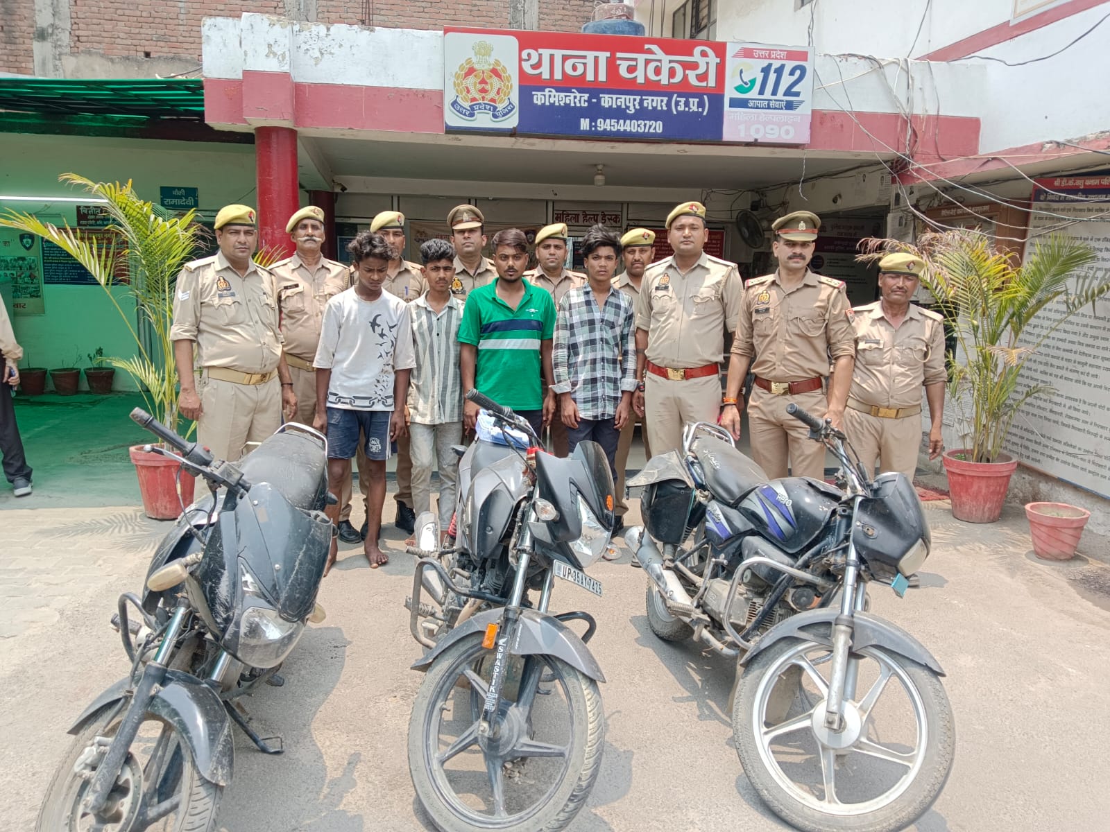 कानपुर, पुलिस आयुक्त कमिश्ररेट कानपुर नगर द्वारा अपराध एवं अपराधियों के विरूद्ध चलाये जा रहे अभियान के क्रम में व पुलिस उपायुक्त पूर्वी व अपर पुलिस उपायुक्त पूर्वी व सहायक पुलिस आयुक्त चकेरी कमिश्नरेट कानपुर नगर के निर्देशन व प्रभारी निरीक्षक चकेरी के कुशल नेतृत्व में थाना थाना चकेरी कानपुर नगर से सम्बन्धित अभियुक्तगण अविराज कुशवाहा पुत्र अमित कुमार कुशवाहा नि० विराट नगर अहिरवा थाना चकेरी कानपुर नगर उम्र करीब 20 वर्ष अर्जुन नागर उर्फ समीर पुत्र बाबुल नागर नि० जगदंबा पेट्रोल पंप के पीछे रामादेवी थाना चकेरी कानपुर नगर उम्र करीब 18 वर्ष तथा राज वर्मा पुत्र अक्षयलाल वर्मा नि० हरिजनपुरखा चकेरी थाना चकेरी कानपुर नगर उम्र करीब 18 वर्ष ओमी गुमा पुत्र विनोद कुमार गुप्ता निवासी 105 बी गांधीग्राम रामादेवी थाना चकेरी कानपुर नगर उम्र करीब 18 वर्ष को नियमानुसार थाना चकेरी की पुलिस बल द्वारा अभियुक्तगण उपरोक्त को मय माल के गिरफ्तार किया गया है। दौराने गिरफ्तारी मा० उच्च न्यायालय / मा० सर्वोच्च न्यायालय के आदेशों। निर्देशों का अक्षरसः पालन किया व कराया गया है। गिरफ्तार शुदा अभियुक्तगण उपरोक्त को थाने लाकर विधिक कार्यवाही करते हुये नियमानुसार मा० न्यायालय के समक्ष प्रस्तुत किया गया!
