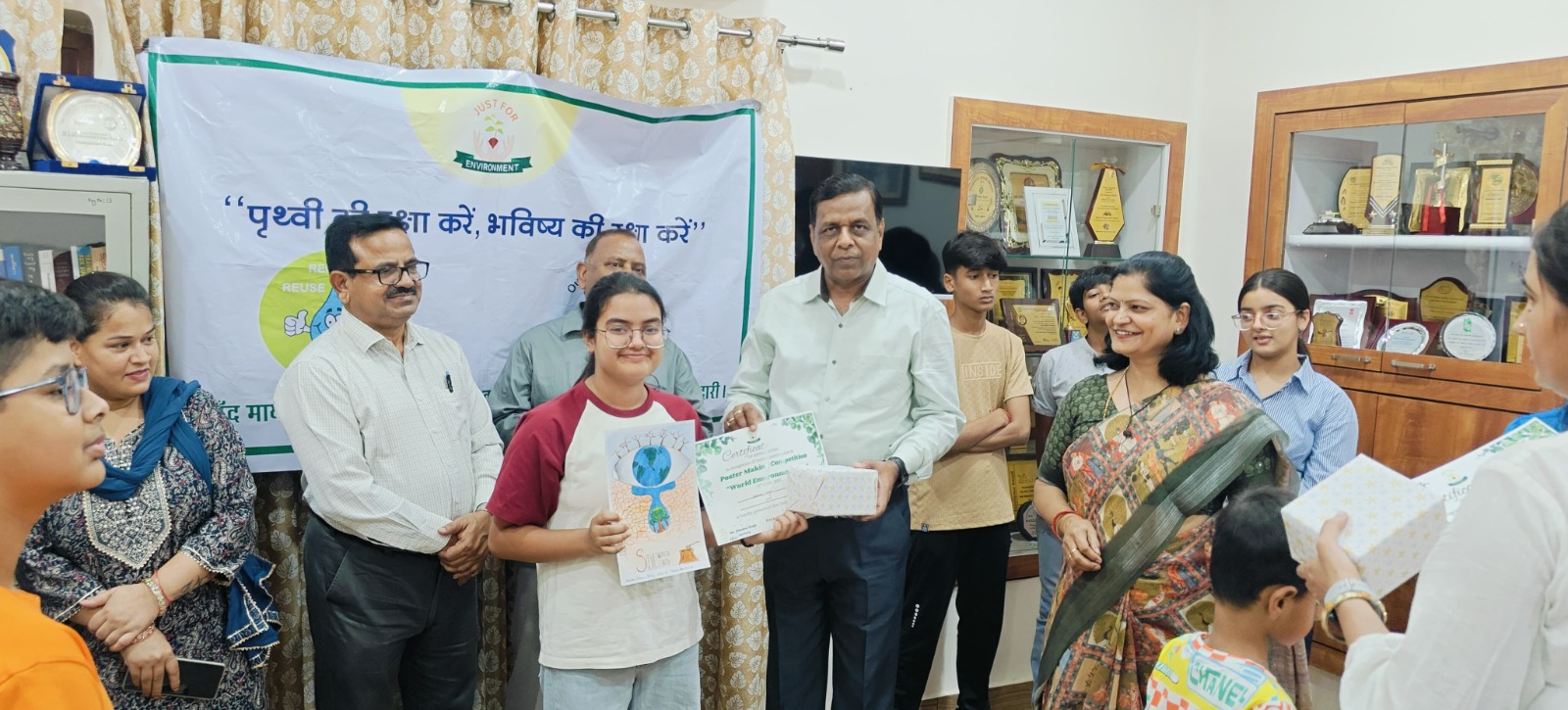 विश्व पर्यावरण दिवस’ के अवसर पर “जस्ट फॉर एनवायरनमेंट” संस्था द्वारा विभिन्न विद्यालयों के विद्यार्थियों के लिए चित्रकला प्रतियोगिता आयोजित की गई। यह प्रतियोगिता दो श्रेणियों के विद्यार्थियों के लिए आयोजित की गई थी, एक -पृथ्वी को बेहतर बनाने के लिए पेड़ बचाएँ” विषय पर कक्षा पाँच तक के विद्यार्थियों के लिए तथा दूसरी पर्यावरण को बचाने के लिए जल बचाएँ” विषय पर कक्षा छठी से कक्षा बारहवीं तक के विद्यार्थियों के लिए। प्रतियोगिता में बड़ी संख्या में विद्यार्थियों ने भाग लिया तथा प्रतियोगिता के विषय पर कुछ असाधारण चित्रकलाओं के माध्यम से अपनी भावनाओं को व्यक्त किया। अध्यक्ष सुश्री अनीता अग्रवाल ने प्रतिभागियों को किसी भी प्रकार के प्रदूषण को रोकने तथा प्राकृतिक संसाधनों के संरक्षण के लिए शपथ दिलाई। संरक्षक प्रो. नरेंद्र मोहन ने विजेताओं को पुरस्कार वितरित किए। जूनियर छात्र वर्ग में रेयान गुप्ता, अंश द्विवेदी और इशानी जायसवाल को क्रमशः प्रथम, द्वितीय और तृतीय स्थान मिला। जबकि सीनियर छात्र वर्ग में कु. शिवी विश्वकर्मा, कु. ईशानवी नाग और कु. जान्हवी ने प्रथम, द्वितीय और तृतीय स्थान हासिल किया। यह सिर्फ जीतने के बारे में नहीं है; यह सीखने, साझा करने और समझने के बारे में है कि हममें से हर एक की अपनी खूबसूरत पृथ्वी की रक्षा करने में भूमिका है। यहां प्रत्येक पोस्टर एक चित्र नहीं बल्कि एक बयान, एक सपना और कार्रवाई का आह्वान है, संयोजिका नीलम चतुवेदी ने कहा। सचिव जितेन्द्र सिंह तथा अन्य सदस्यों, सुश्री अर्चना शर्मा, सुश्री नीलम चतुर्वेदी, सुश्री अनुष्का, सुश्री श्रुति शुक्ला, सुश्री स्वेच्छा तथा सुश्री काव्या अग्रवाल ने कार्यक्रम के संचालन में सक्रिय रूप से भाग लिया।