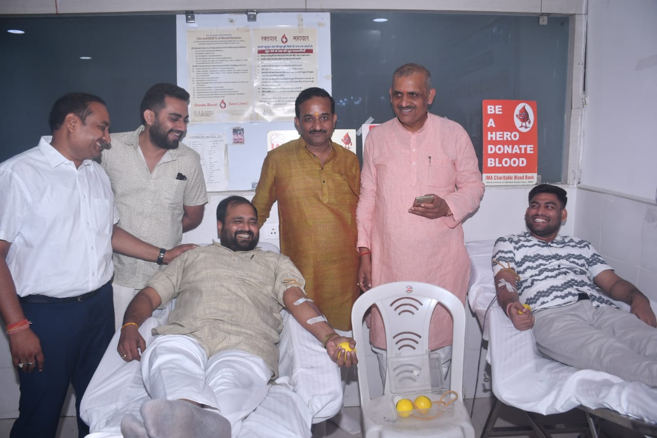 कानपुर, समाजवादी पार्टी आर्य नगर विधायक अमिताभ बाजपेई के जन्मदिन पर परेड स्थित आई एम ए  हाल ब्लड बैंक में रक्तदान शिविर का आयोजन किया गया। रक्तदान शिविर में सुबह से ही सैकड़ो कार्यकर्ताओं की भीड़ उमड पड़ी रक्तदान में कार्यकर्ताओं के साथ अन्य लोगों ने भी बड चड का हिस्सा लिया। लगभग 100 यूनिट के ऊपर रक्तदान किया गया। इस अवसर पर आर्य नगर विधायक अमिताभ बाजपेई  ने बताया कि जन्मदिन के अवसर पर कार्यकर्ताओं के साथ-साथ जनता का सहयोग रहा जीवन में सबसे बड़ा दान रक्तदान जिस तरह से बीमारियां फैली हुई है हर इंसान को रक्त की आवश्यकता पड़ रही है यह एक छोटी सी पल मेरी तरफ से है। सर्वेश यादव यीशु हाजी जिया यादव नीरज, वीरेंद्र त्रिपाठी, बिजेंद्र यादव,करुणेश श्रीवास्तव, एहसास बॉबी पार्षद फखर इकबाल कौशिक बाजपेई, दिपा यादव, दिपीका मिश्रा,मोहम्मद सारिया,राजू, वरुण मिश्रा, गगनदीप, सलाम इदरीसी, इत्यादि लोग रहे!