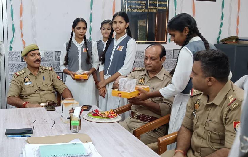छात्राओं ने पुलिसकर्मियों को राखी बाँधी
