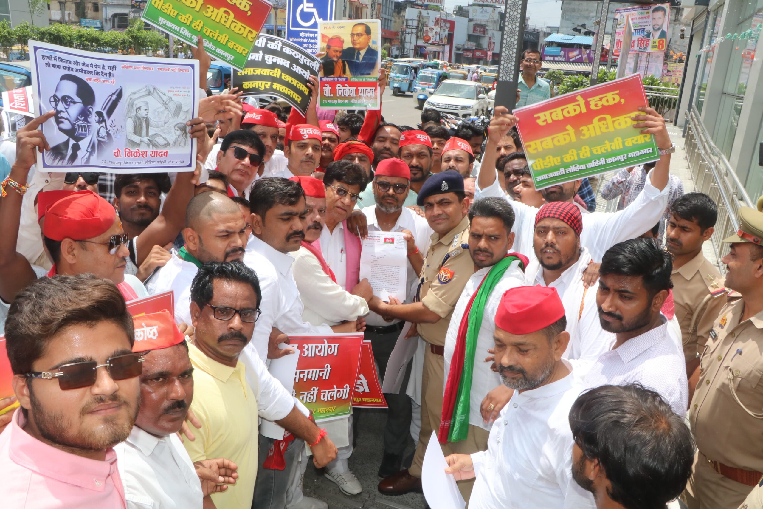 कानपुर सोमवार समाजवादी पार्टी कानपुर महानगर एवं फ्रंटल संगठन एवं पीडीए युवा टीम ने स्पेशल इंटेसिव रिवीजन एस आई आर के विरोध में सपा महानगर अध्यक्ष हाजी फजल महमूद के नेतृत्व में विशाल प्रदर्शन दोपहर 12:00 बजे आरंभ हुआप्रदर्शन का जुलूस नवीन मार्केट परेड से चलकर सोमदत्त प्लाजा तक गया वहीं पर ज्ञापन दिया गया विशाल प्रदर्शन में समाजवादी पार्टी कानपुर महानगर के अध्यक्ष हाजी फजल महमूद ने नेताओं एवं कार्यकर्ताओं को संबोधित करते हुए कहा कि देश में लागू की गई स्पेशल इंटेसिव रिवीजन के माध्यम से केंद्र की भाजपा सरकार वोट चोरी करके गलत तरीके से सत्ता की गद्दी पर काबिज हो गई है जबकि वोट हमारे लोकतंत्र की नीव है लेकिन केंद्र की भाजपा सरकार एक संगठित हमला कर रही है इसमें चुनाव आयोग सरकार का साथी बना हुआ है केंद्र की भाजपा सरकार खुलेआम वोट चोरी करके देश में कायम लोकतंत्र की हत्या कर रही है जो कि संविधान रचयिता बाबा साहब डॉक्टर भीमराव अंबेडकर का खुलेआम अपमान है यह केंद्र की भाजपा सरकार एस आई आर के माध्यम से वोट चोरी करके चोरी चुपके जनता द्वारा दिए गए भाजपा विरोधी फैसले पर डाका डालने का कार्य कर रही है जनता की आवाज को खुलेआम दबाया जा रहा है इस सरकार में सरकार विरोधी आवाज उठाने पर देश के दबे कुचले मजदूर छात्रों नौजवानों किसान व्यापारी अल्पसंख्यकों पर अत्याचार किया जा रहा है