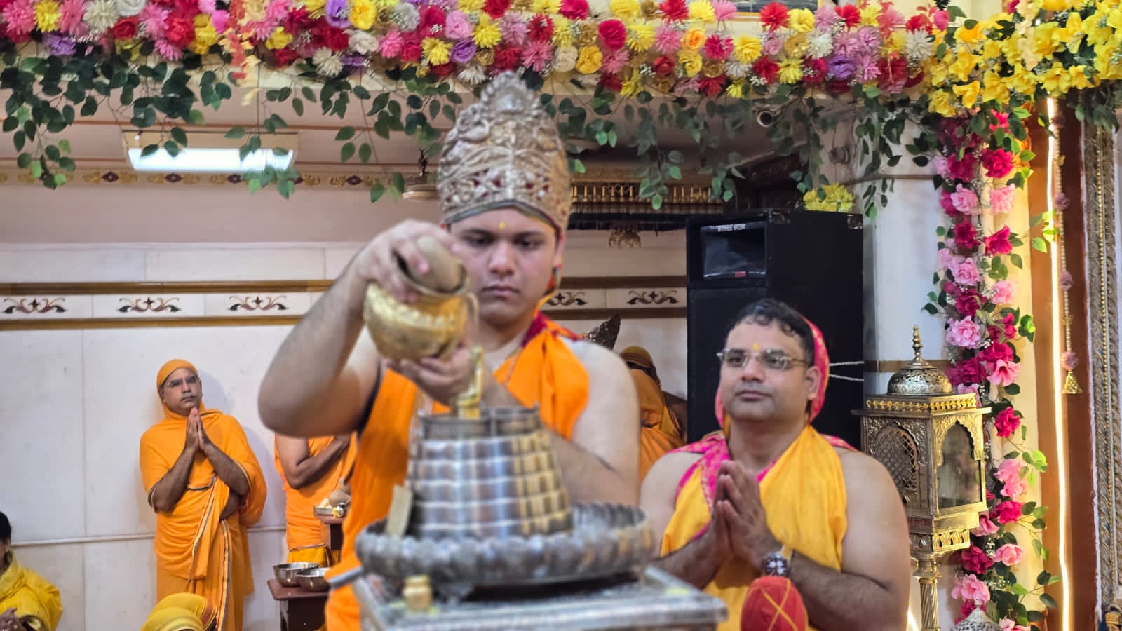 कानपुर, स्वर्ण जैन मन्दिर श्री दिगम्बर जैन पंचायती बड़ा मन्दिर जनरलगंज मे आज प्रातःकाल श्री जी जलाभिषेक-नित्यनियम पूजा-पाठ-शान्तिधारा के साथ-साथ तीर्थकर पुष्पदन्त भगवान का मोक्ष कल्याण बडी धूमधाम एवं उत्साह से साथ मनाया गया । महायज्ञ नायक भामाशाह गुरूभक्त प्रदीप जैन जी के सुपौत्र आस्ट्रेलियाई से आऐ धार्मिक जैन ने प्रथम शान्तिधारा करने का सौभाग्य प्राप्त किया,अपने जन्मदिन के शुभ अवसर अभिषेक जैन सुपुत्र राजेश जैन ने ध्दितीय तृतीया अंकुर जैन सुपुत्र सुभाष जैन ने की। उसके उपरान्त श्रेयासं जैन के भजनो के माध्यम से सभी पुरूषो एवं महिलाऐ ने भाव नृत्य के माध्यम से लाडू अर्पण किया गया ।